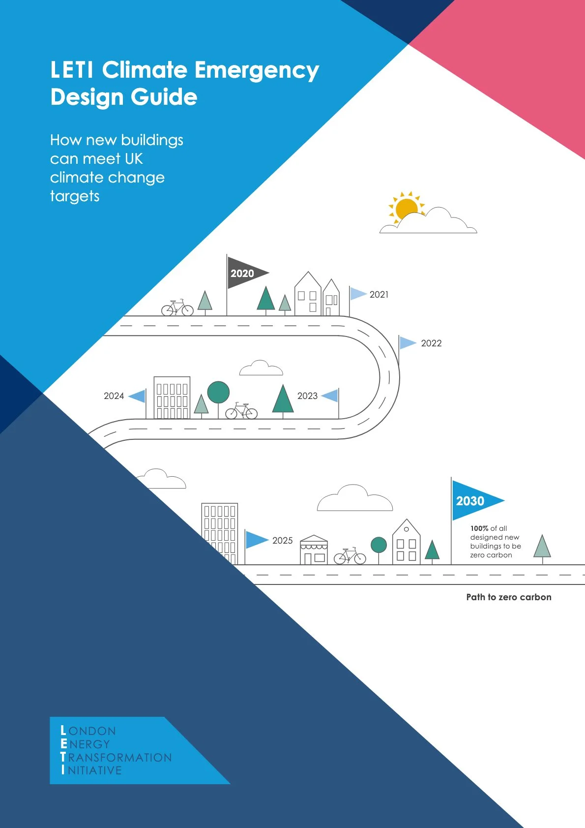 The document titled "100% of all designed new buildings to be zero carbon" is a comprehensive guide published by the London Energy Transformation Initiative (LETI). It emphasizes the urgent need for the construction industry to transition towards net-zero carbon buildings to meet climate change targets. The guide is developed by a coalition of over 1,000 built environment professionals dedicated to achieving a sustainable built environment in the UK and beyond.