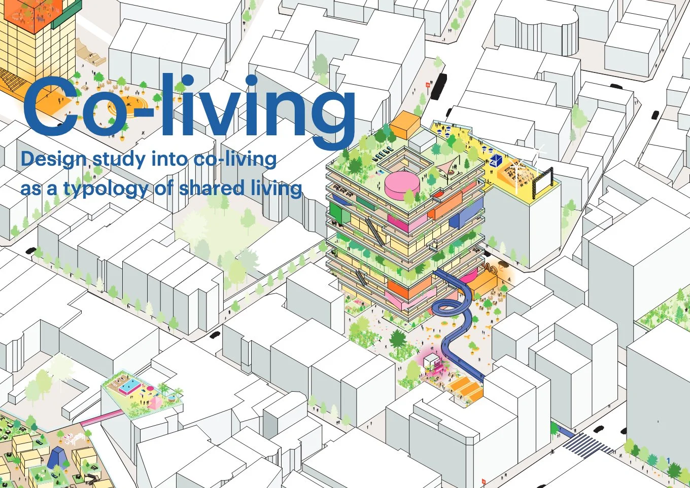 This resource is a design study titled "Co-living - Design study into co-living as a typology of shared living," published by MVRDV, HUB, and Bridges Fund Management. The authors include Winy Maas, Sanne van Manen, Damien Sharkey, Kate Brown, Celia Harrison, and Peter Murray. The study explores co-living as an emerging housing solution that addresses modern challenges like housing shortages, climate change, and social isolation.