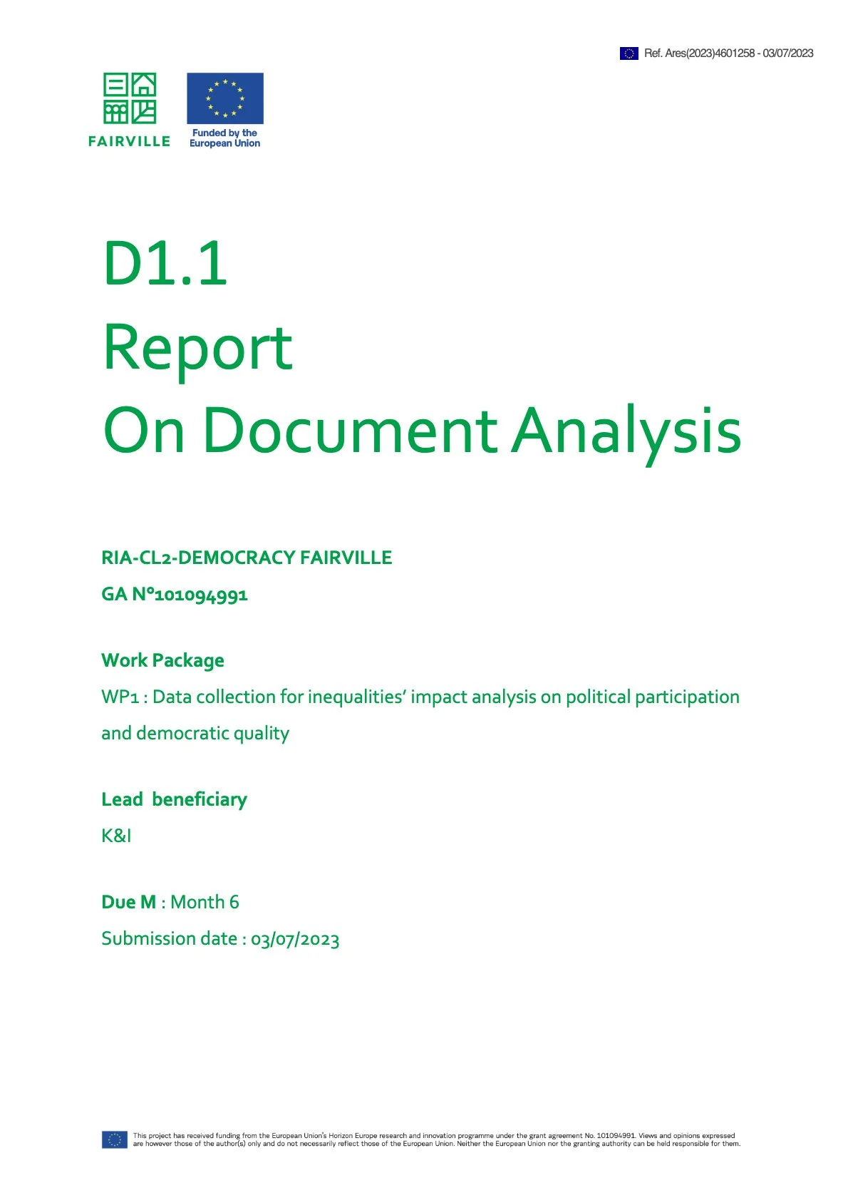 This deliverable, “D1.1 Report on Document Analysis”, is published by FAIRVILLE and authored by Alfonso Alfonsi, Maresa Berliri, Federico Marta and Daniele Mezzana. It reports the early results of Work Package 1 (WP1) on data collection for analysing how inequalities affect political participation and democratic quality, with a focus on deprived neighbourhoods and resident participation.