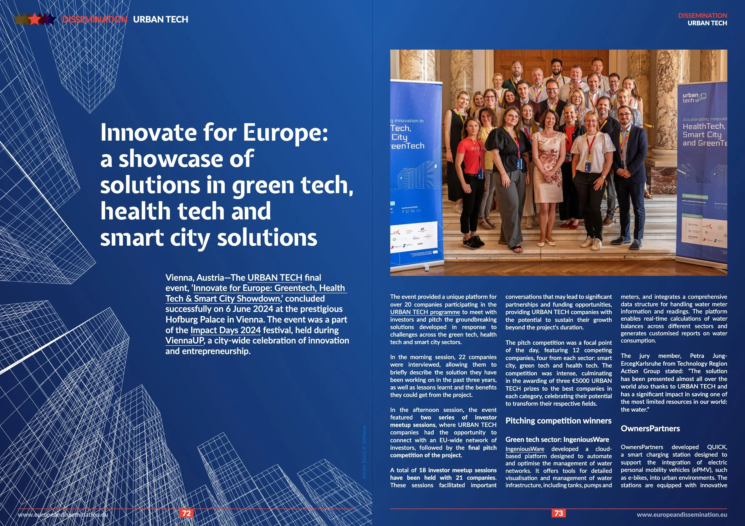 The resource titled "Innovate for Europe: a showcase of solutions in green tech, health tech and smart city solutions" is published by European Dissemination. It highlights the URBAN TECH final event that brought together various innovative companies and investors to discuss advancements in sustainable technology and urban solutions.