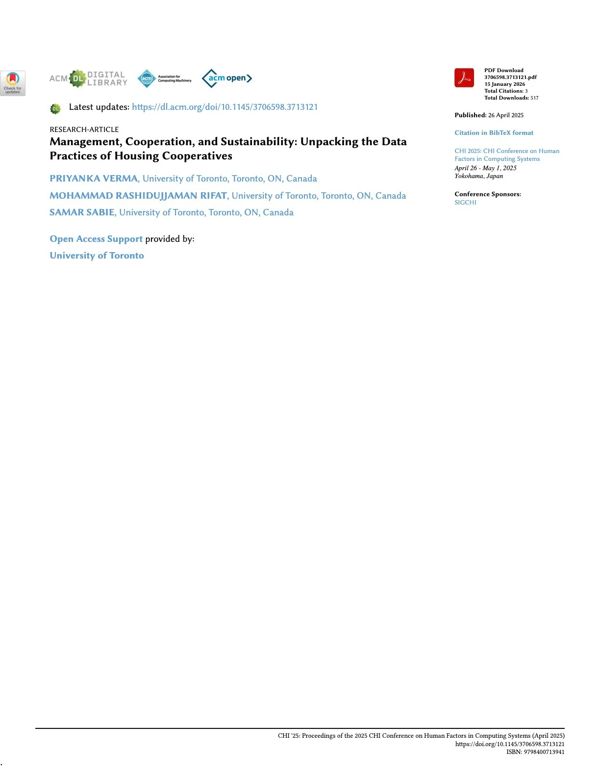 The article "Management, Cooperation, and Sustainability: Unpacking the Data Practices of Housing Cooperatives" is authored by Priyanka Verma, Mohammad Rashidujjaman Rifat, and Samar Sabie from the University of Toronto. It explores data practices within a non-profit housing cooperative in Toronto, anonymized as NXI. The research aims to examine how financial, social, and maintenance data influence the cooperative's operations, sustainability, and cooperation among members. This study is significant, given the growing interest in cooperative housing as a viable alternative to traditional housing models, particularly in the face of rising housing costs across Europe.