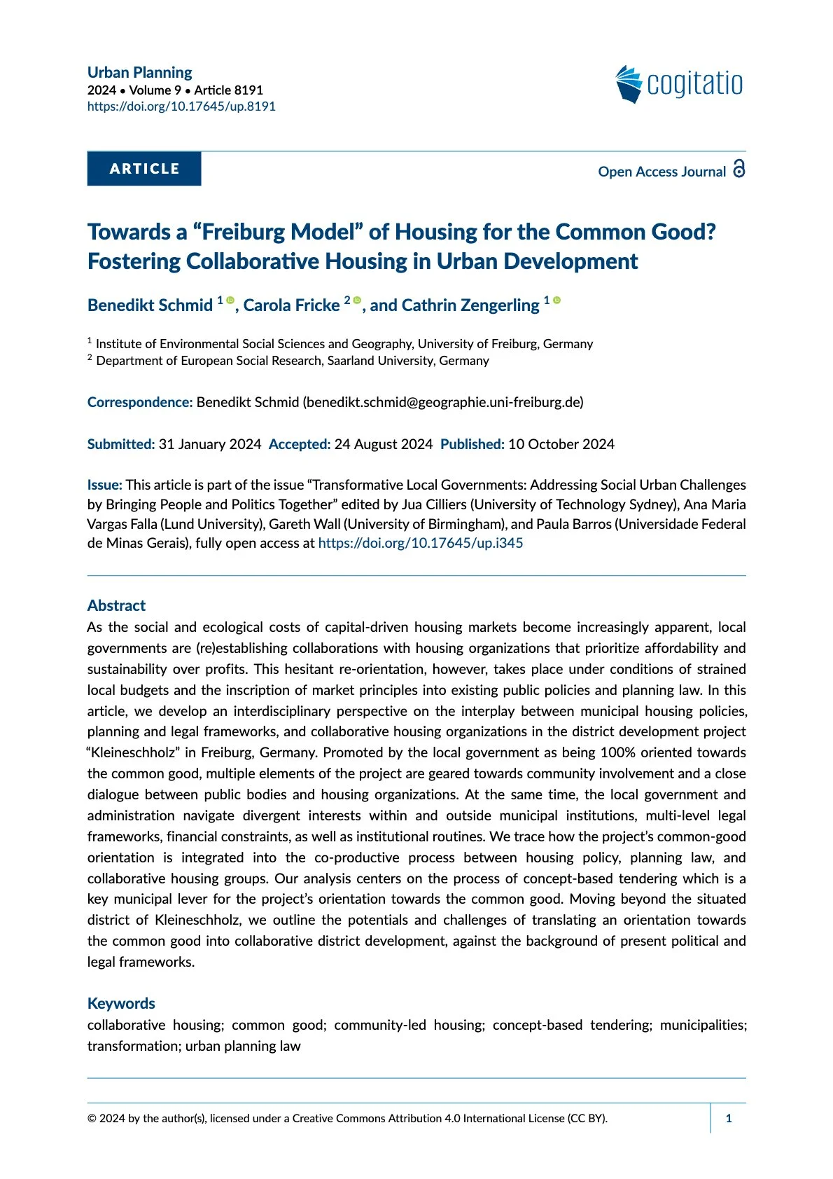 The article "Towards a Freiburg Model of Housing for the Common Good? Fostering Collaborative Housing in Urban Development" is published in the journal Urban Planning by Benedikt Schmid, Carola Fricke, and Cathrin Zengerling. The authors hail from the Institute of Environmental Social Sciences and Geography at the University of Freiburg and the Department of European Social Research at Saarland University. Their research focuses on innovative urban development practices that prioritize social and ecological sustainability.